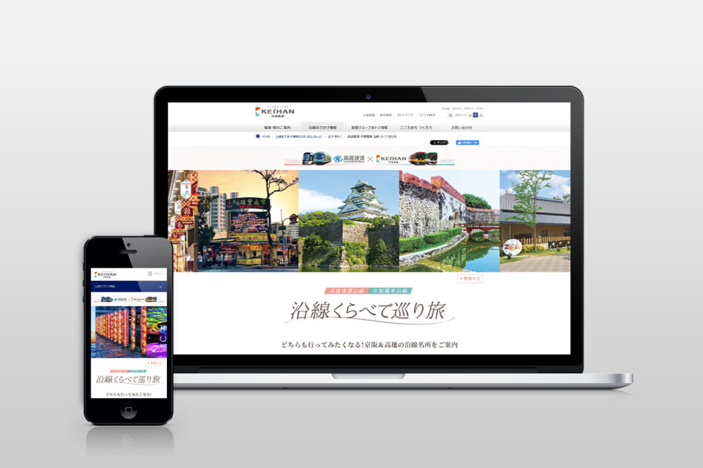 日本と台湾の観光スポットを紹介する特集ページ。情報量が多い中、大きな文字とシンプルなレイアウトで、読みやすさを重視。パソコンの広い画面だけでなく、スマートフォンの狭い画面でも適切に表示されるように対応(レスポンシブデザイン)。