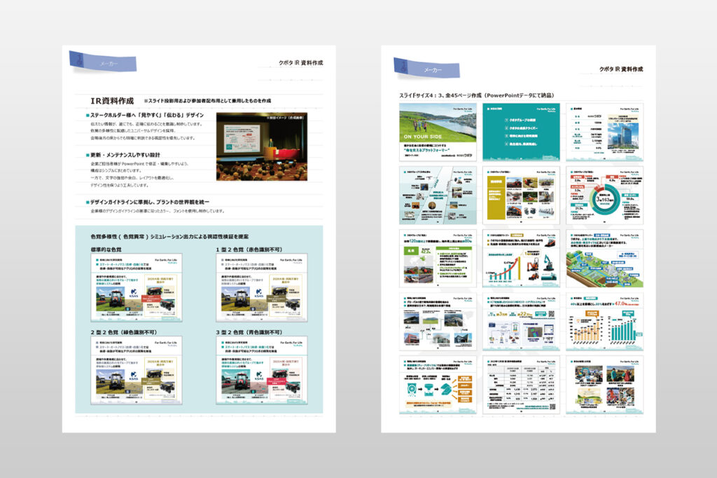 スライド投影⽤および参加者配布⽤のIR資料をブラッシュアップ。デザインガイドラインの基準に準拠した上で、ステークホルダー様に「見やすく」「伝わる」デザインへ。企業ご担当者様が修正・編集しやすいように、PowerPointデータにて納品。