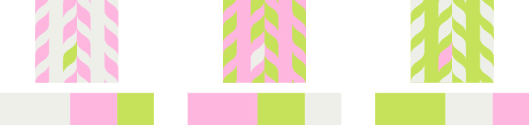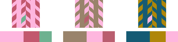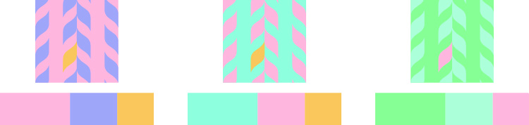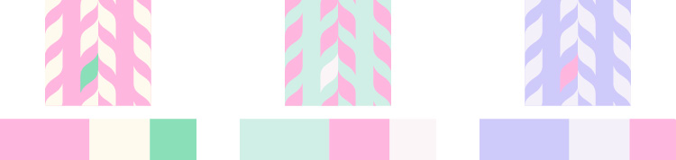 明るいピンクに、ラベンダーやイエロー、ライトブルーを組み合わせた配色パターン。色の対比が楽しく、軽やかで親しみやすいポップな印象です。
