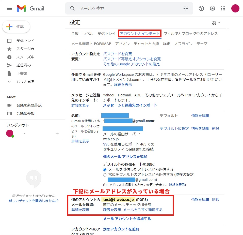 「アカウントとインポート」タブにて、「他のアカウントのメールを確認」にメールアドレスが入っている場合、今回の対象です。