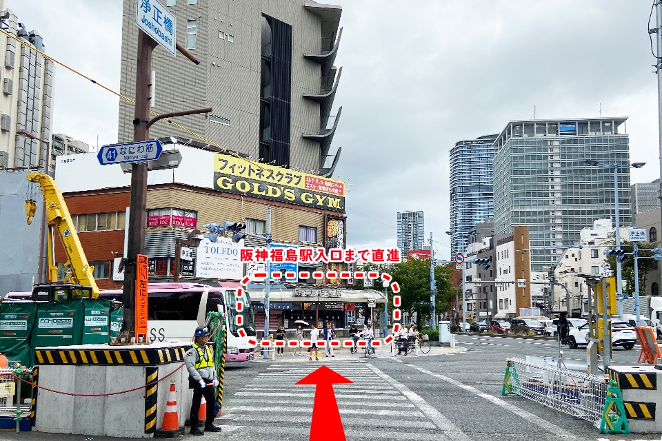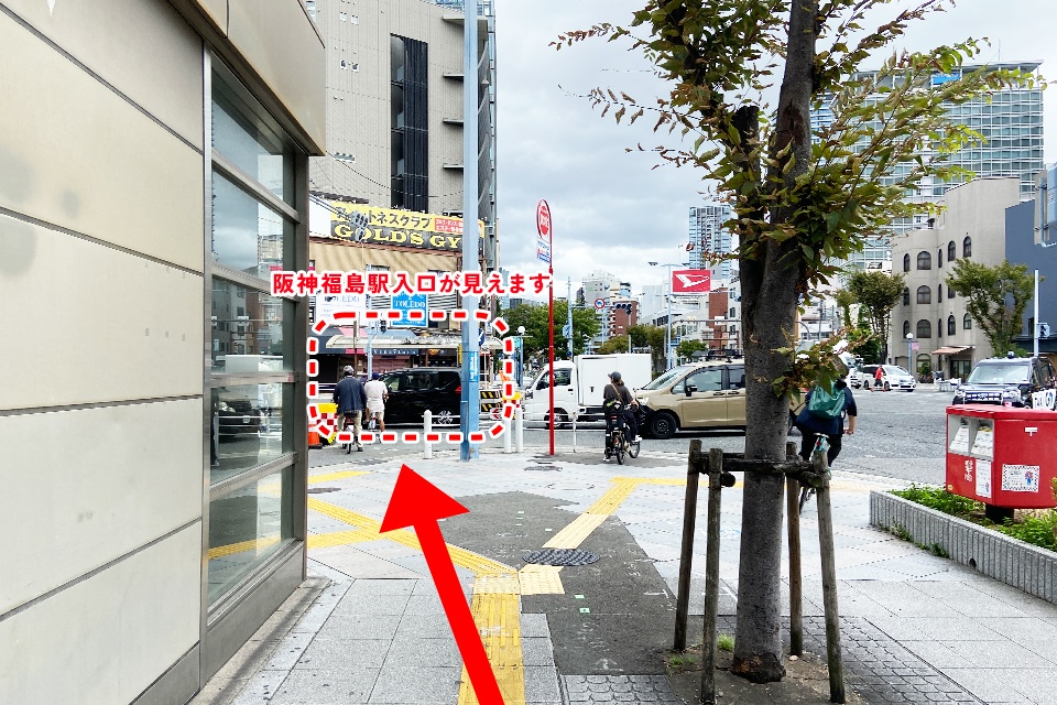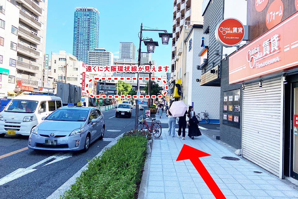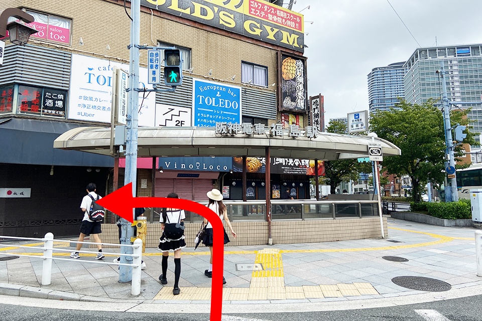 【16】横断歩道を渡ったら、阪神福島駅入口手前を左へ曲がってください