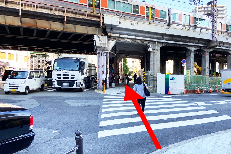 【21】横断歩道を渡り、大阪環状線の高架を直進してください